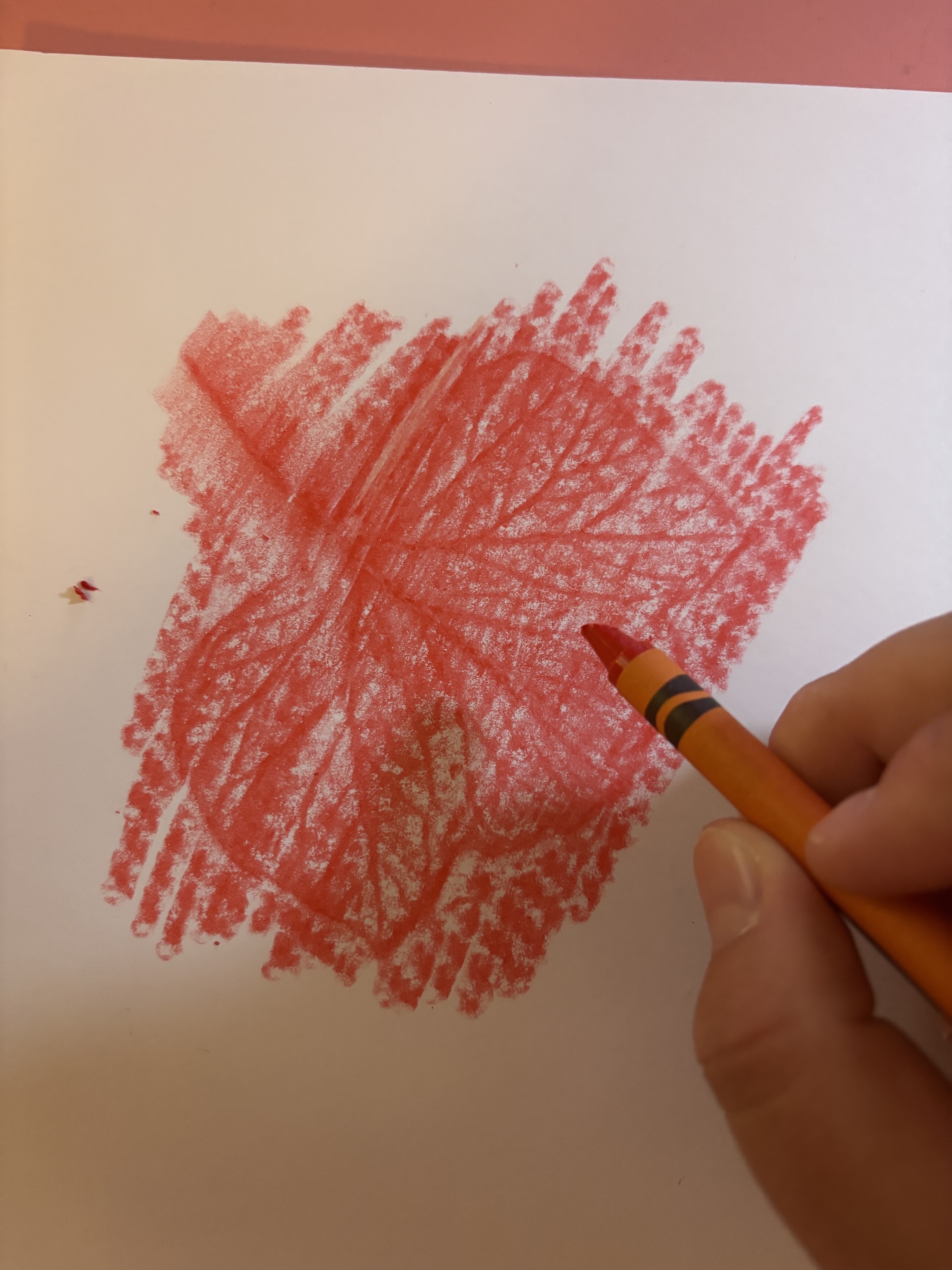 • Using a crayon, color on top of the paper where the leaf is. You should start to see the texture of the leaf come onto your page. You will need to use a lot of pressure for the texture to come through.