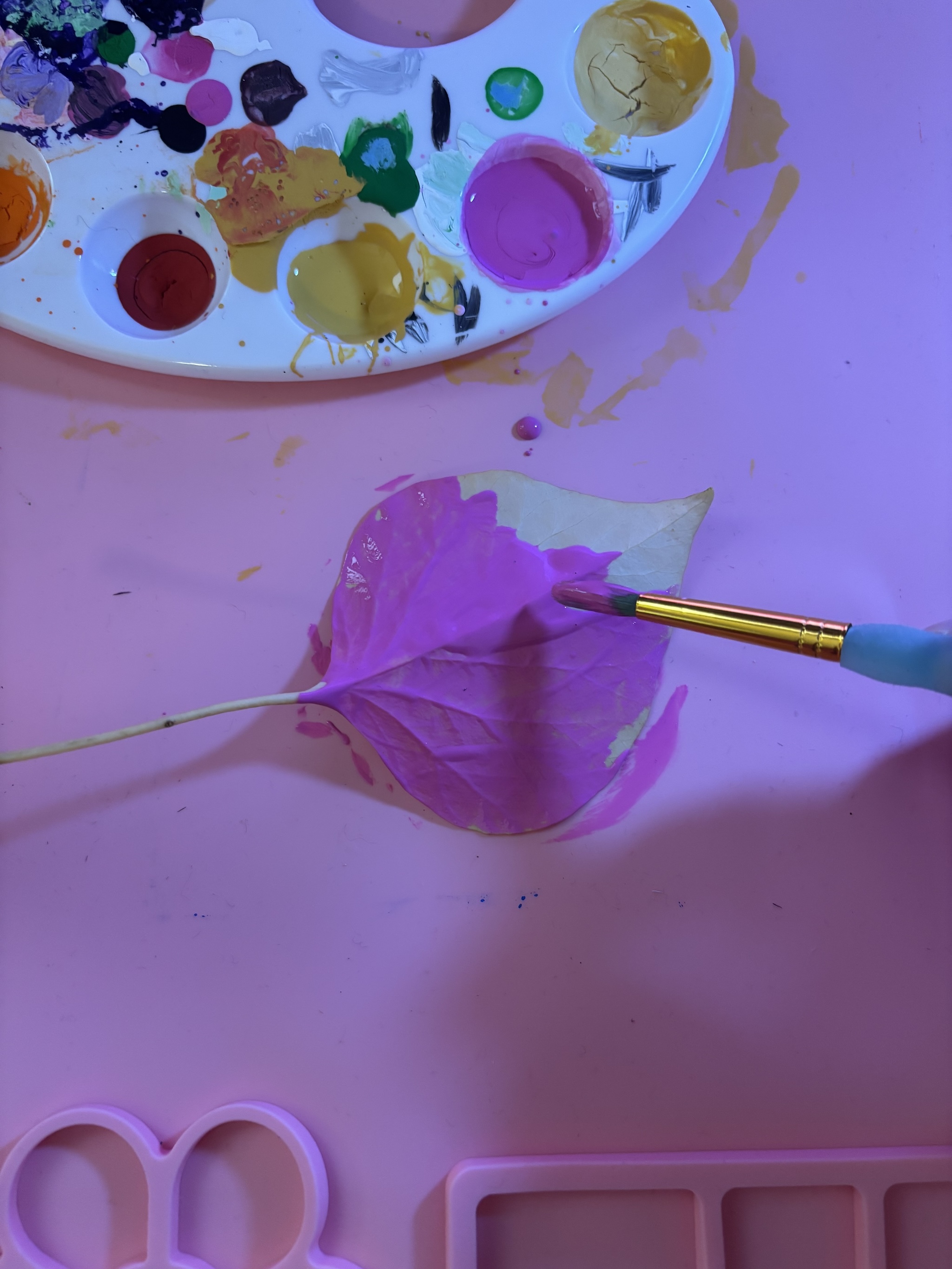 - Slowly peel the leaf up to see the leaf’s impression. Let the paint dry before adding more details.
