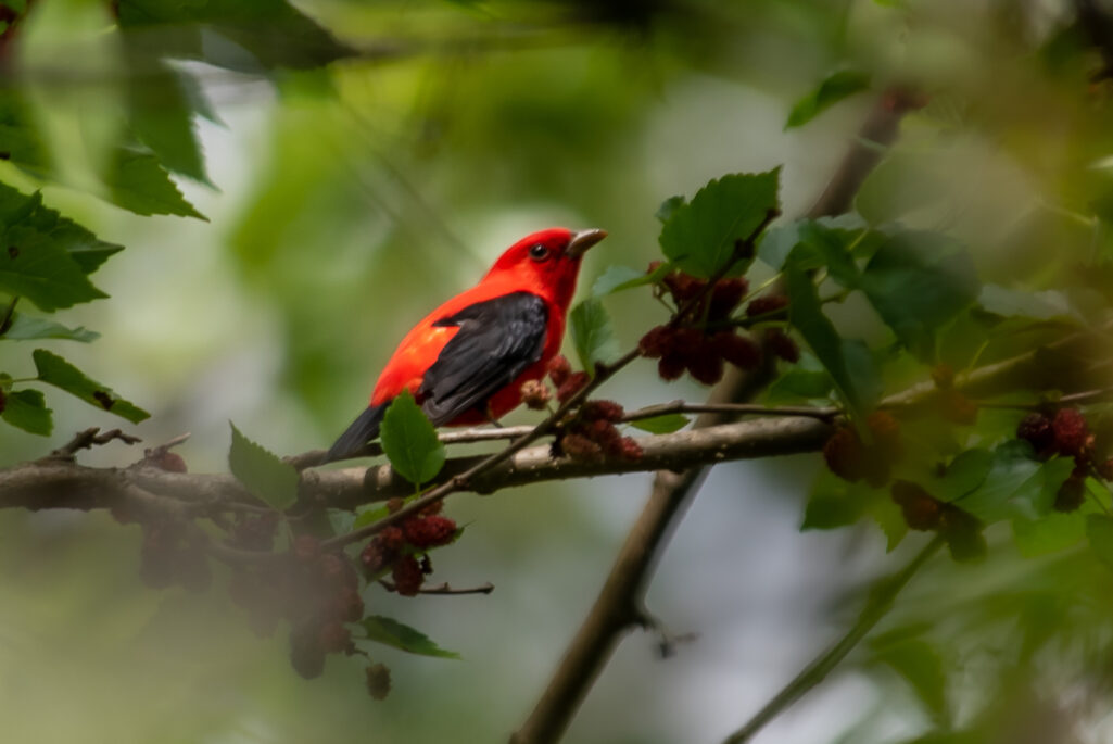 Scarlet Tanager: I saw this bird from the back deck and the bright red color was visible from a long distance away. This bird has become one of my favorites–maybe because of the UGA black and red coloring?