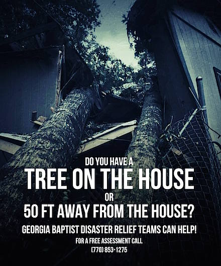 Those needing assistance may call the Georgia Baptist Disaster Relief Team at 770-853-1275 during the hours of 8 a.m.-5 p.m. today (Sept. 16) and tomorrow, Sunday, Sept. 17. The process involves an initial phone interview followed by a site assessment. Renters may request assistance, but property owners must give their consent before any work is done. “The homeowner has to sign to allow them to come onto and work on the property,” Ivey says.