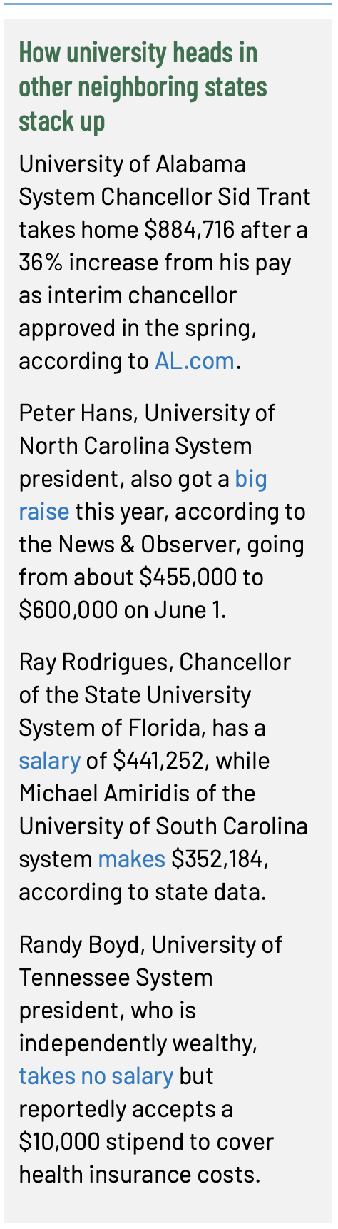 Compared with university system heads in the states bordering Georgia, Perdue’s salary is toward the middle of the pack and less than what the leaders of Alabama and North Carolina’s systems make, following a couple of big raises of their own.