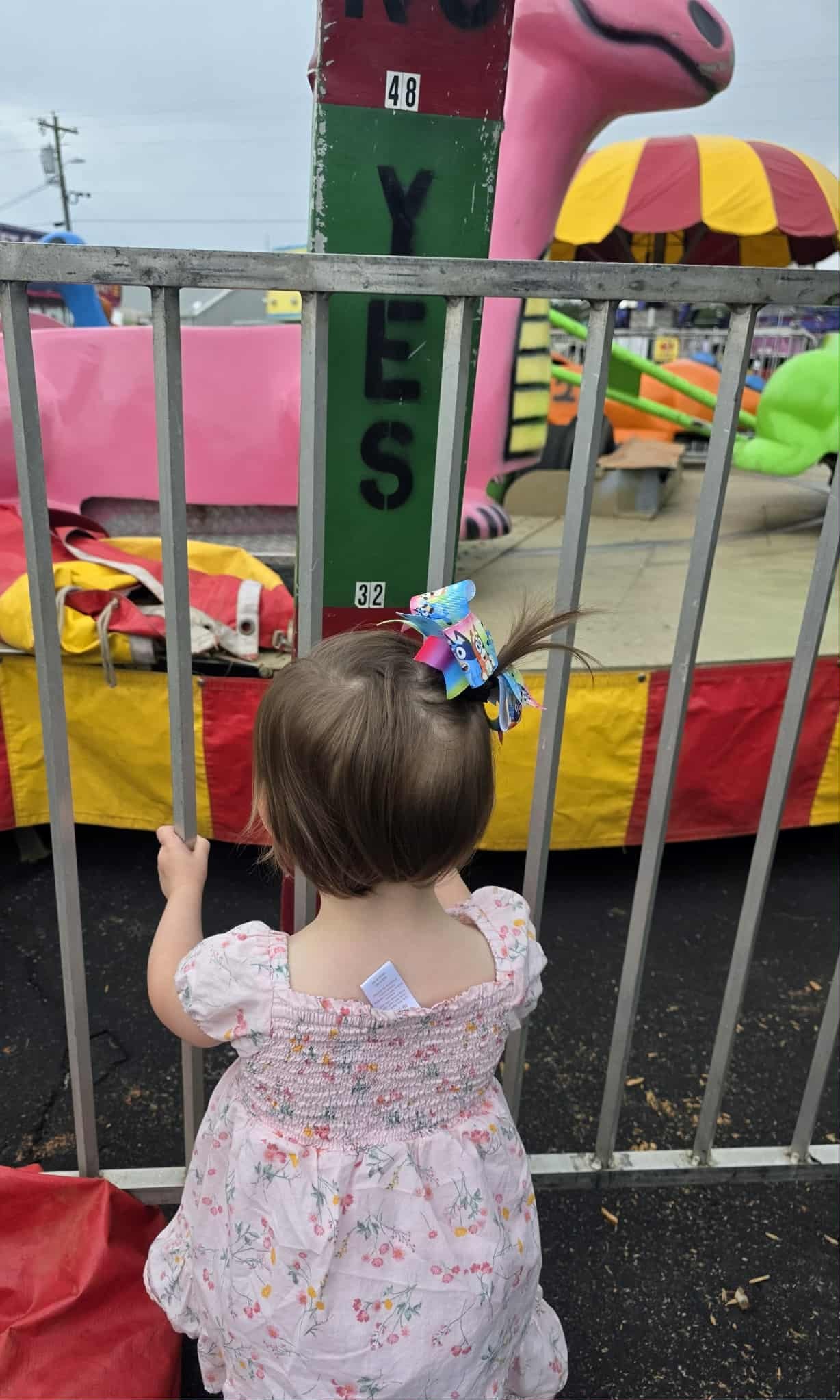 Local toddler, Maple Jean, peered at the pink dinosaur from behind the safety gate. Decked out in a pink dress and a bow nearly as large as her smile, she surveyed the midway, peering up at the Ferris wheel, studying the carousel animals, and testing the hay bales near the livestock pens. She even filed an “application” to judge the baking contest.