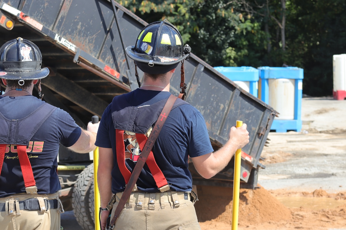 A firefighter pours sand over a pool of peracetic acid that leaked from a punctured container at Predictive Food Safety in Hall County on August 29, 2024. (Hall County Fire Rescue)