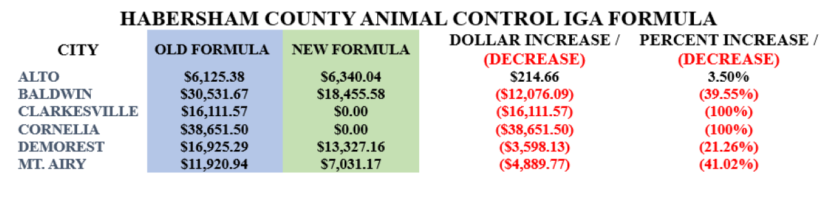 Under the new formula, Baldwin’s animal control fee went from $30,531 to $18,455. Mt. Airy will save nearly $5,000 on its animal control costs, and Demorest’s fee was reduced by nearly $3,600.