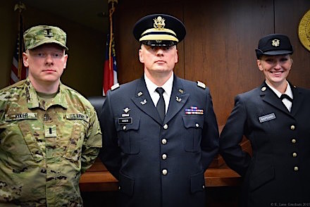 Father and daughter Capt. Cadman Robb Kiker Jr., ASJA, 1BDE GSDF and Cadet Recruit, University of North Georgia, Anna Wynn Kiker Sapough welcomed son and brother 1st Lieutenant Cadman Robb Kiker III as a commissioned officer in a ceremony held September 18 at the Habersham County Courthouse. Shown, from left are Cadman Robb Kiker III, Cadman Robb Kiker Jr. and Anna Wynn Kiker Sapough.