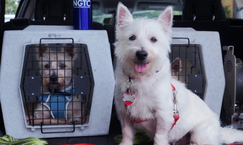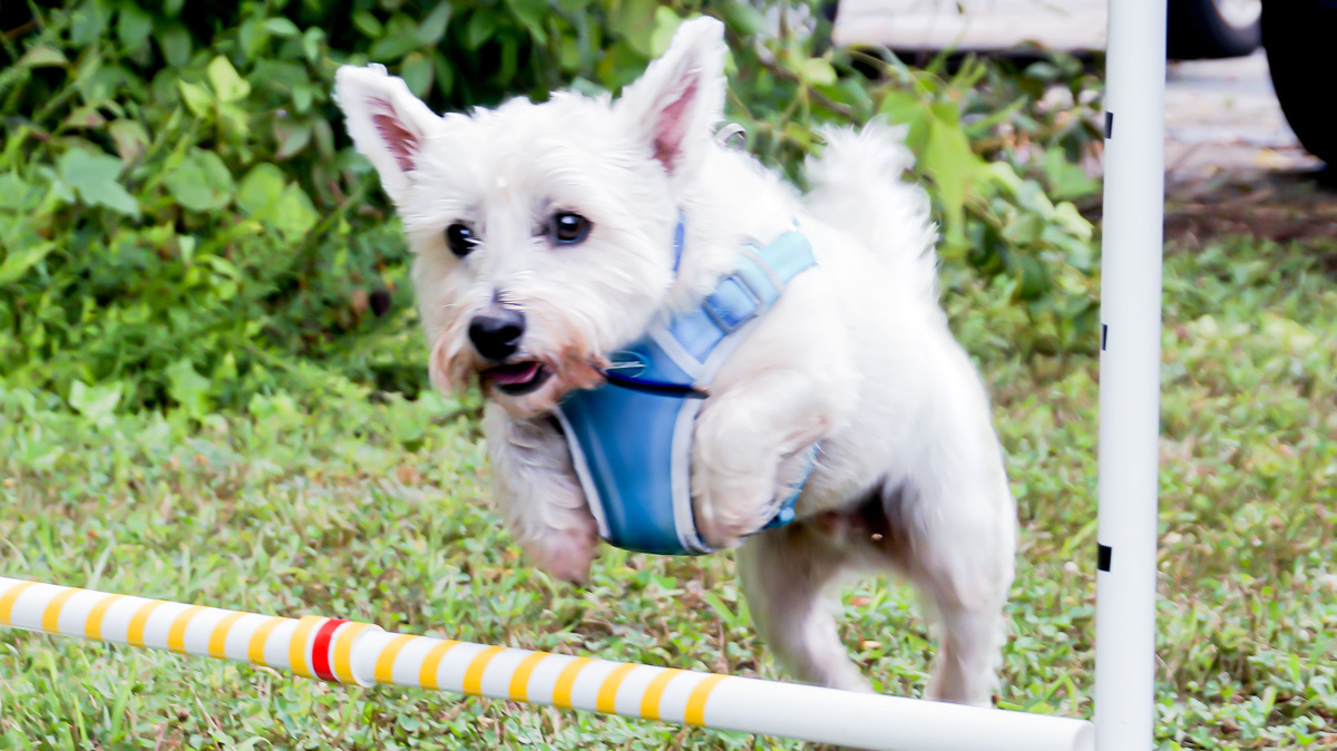Grace [left] and Fisher [right] scope out the other dogs as they arrive. (Photo: Hadley Cottingham, Now Habersham)Robin and Chad Kelly, Habersham vacationers and pet parents to Grace and Fisher, took time away from home in Atlanta to take in the nature Habersham has to offer. After they found out about Clarkesville’s event, they brought out their two Golden Retrievers to make new friends and try their paw at the SouthPaws Sports Scenter’s agility course.