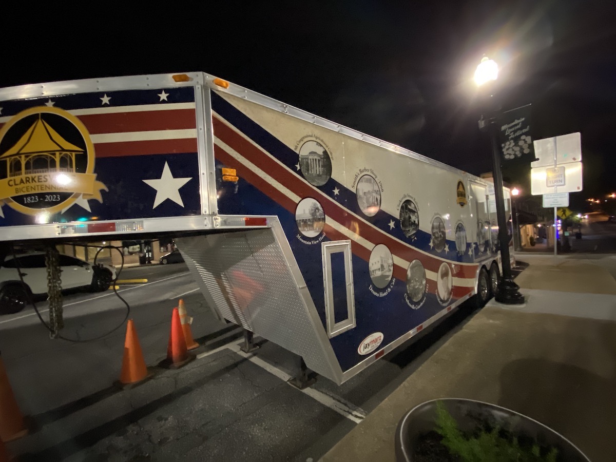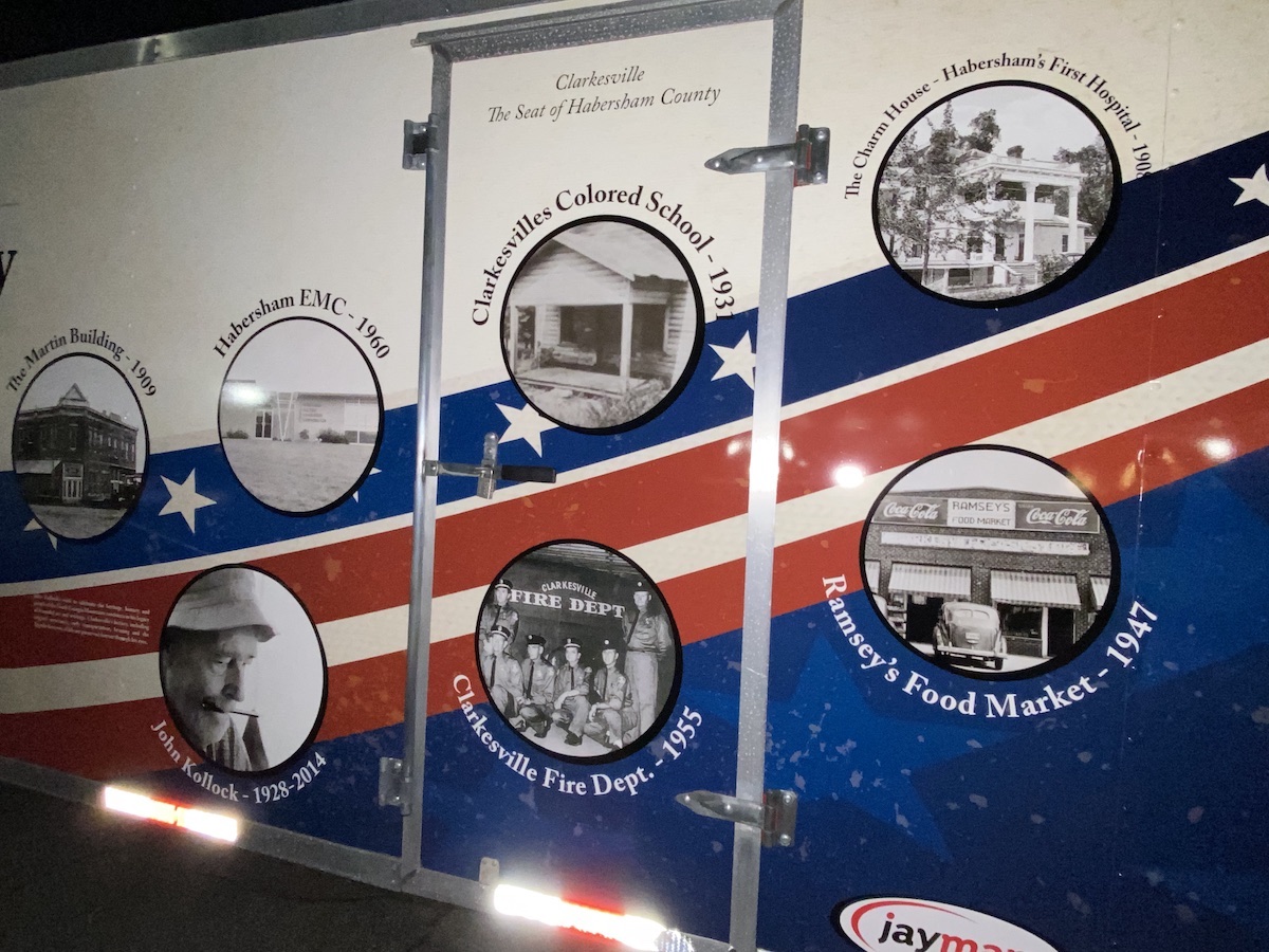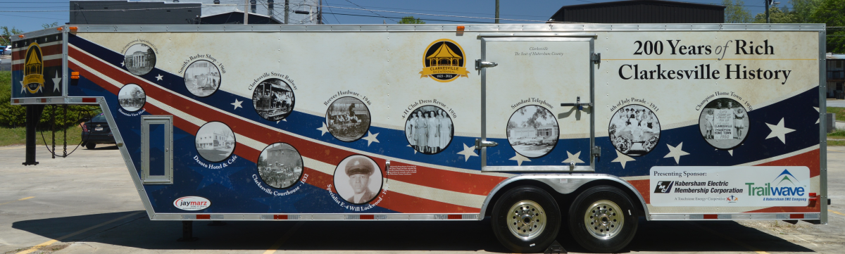 Over the last week, a mysterious trailer appeared on the square in Clarkesville. Vinyl-wrapped with historical images of the town, the 22-foot-long 5th-wheel trailer is a mobile history center.