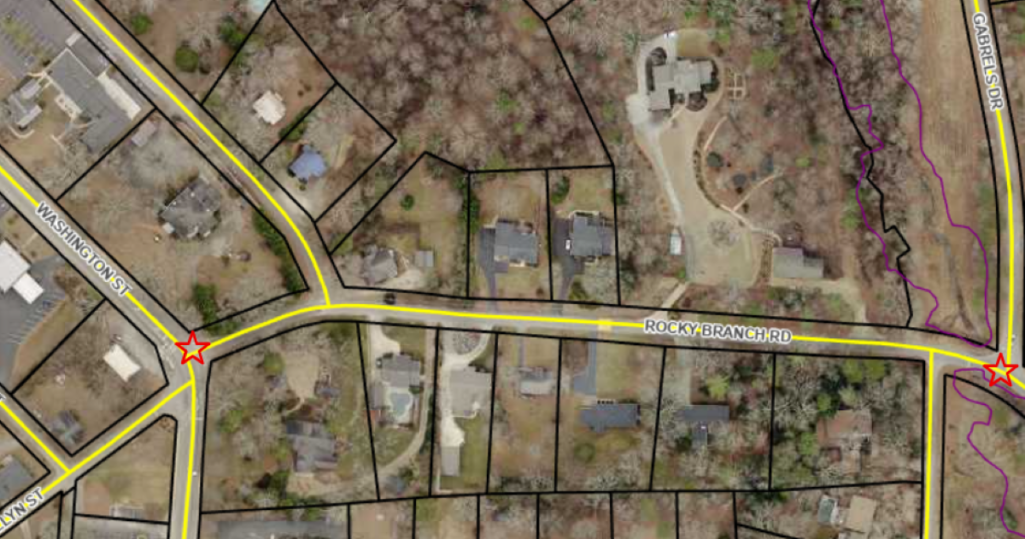 The two stars indicate the stretch of Rocky Branch Road affected by speeders and transfer trucks. (Qpublic.com)