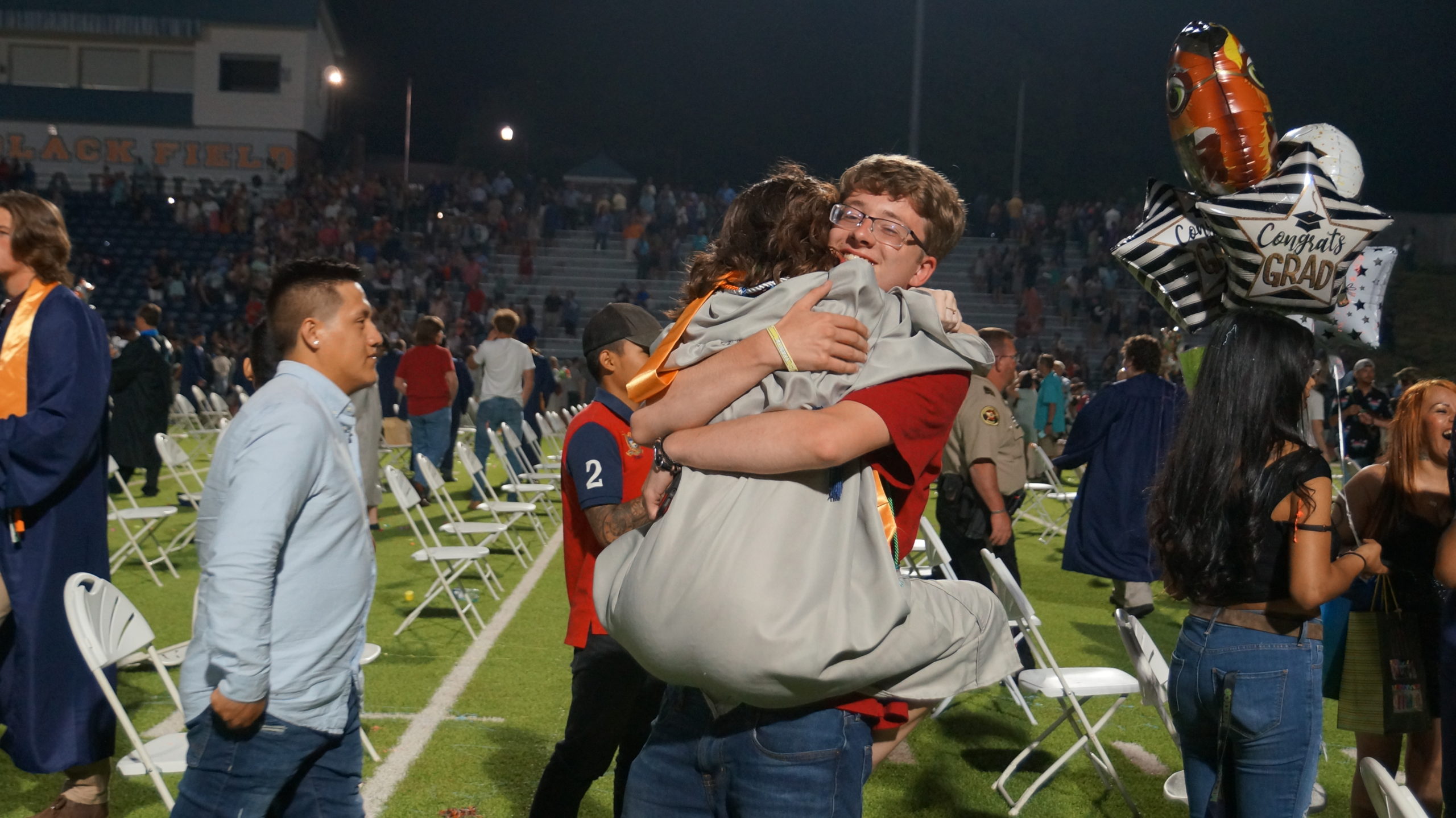As the graduation ceremony came to a close, the field came alive with celebration. The graduates followed the time-honored traditions of tossing beach balls, popping confetti, and spraying silly string. When the ceremony ended just before 10 p.m., the crowds in the stands followed another tradition and rushed onto John Larry Black Field (something that wasn’t allowed in 2020 due to COVID). The new graduates joyously embraced their family and friends.