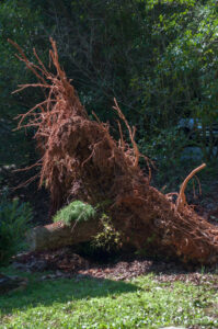 Fortunately no one was home when the storm hit, but when they did arrive it was a sight to behold. One tree uprooted and laying across their front porch, dozens of trees down and another eight were topped. Luckily the freshly painted house had not been badly damaged, and their pet birds, in cages on the carport, were unharmed.
