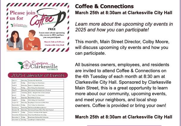 If you are a business owner, employee, or resident of Clarkesville, Georgia, you will want to attend Coffee & Connections. On the 4th Tuesday of each month at 8:30 a.m. at Clarkesville City Hall, the Clarkesville Main Street hosts this event to share the calendar and upcoming events.