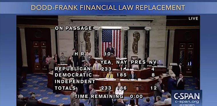 The bill now moves to the Senate where it faces an uphill battle in its present form. At least eight Democrats will have to sign onto the legislation for it to be approved. Senate Republicans are expected to seek bipartisan support as they draft their own legislation to overhaul Dodd-Frank regulations.