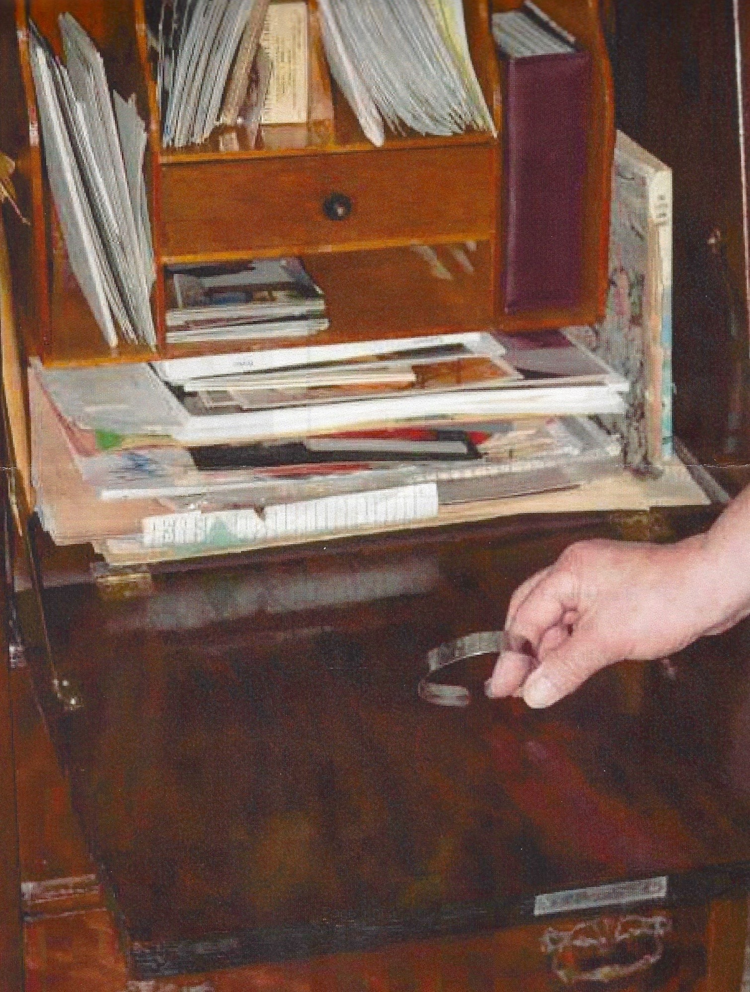 When I obtained the secretary from my parents several years later, the bracelet was placed inside for safekeeping. The secretary has been with me some 48 years and contains the story of my life. It is alive with memorabilia, trinkets, treasures, collectibles, political buttons, my children’s toys and hundreds of old photos.