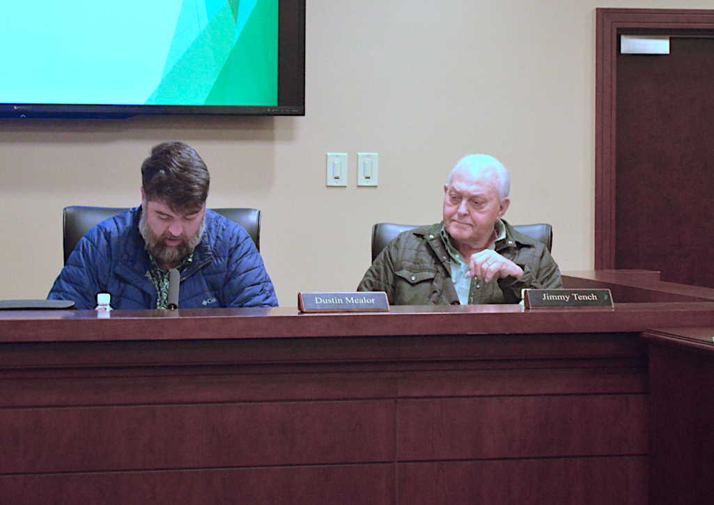 Commissioner Dustin Mealor (left) and Commissioner Jimmy Tench voted with Commissioner Bruce Harkness against approving the lease agreement. (Jerry Neace/NowHabersham.com)