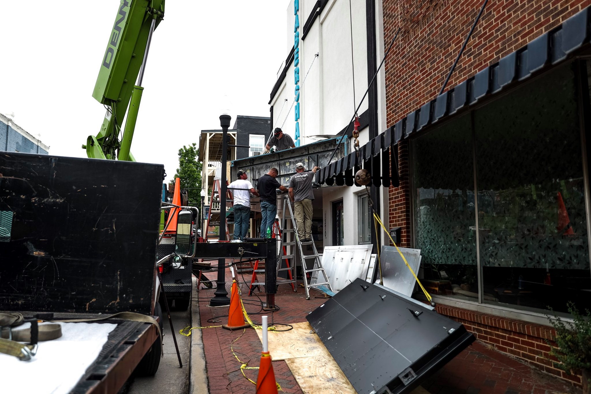 The theater got a facelift this week when contractors exchanged the old hand-lettered movie marquee with two new LED screens.