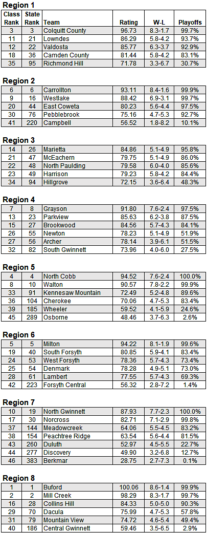 The Maxwell Ratings, compiled by mathematician and Georgia High School Football Historians Association founder Loren Maxwell, have projected the region finishes of all 413 football-playing schools in the GHSA. The projections are based on historical scores, with the most recent season weighing most heavily.