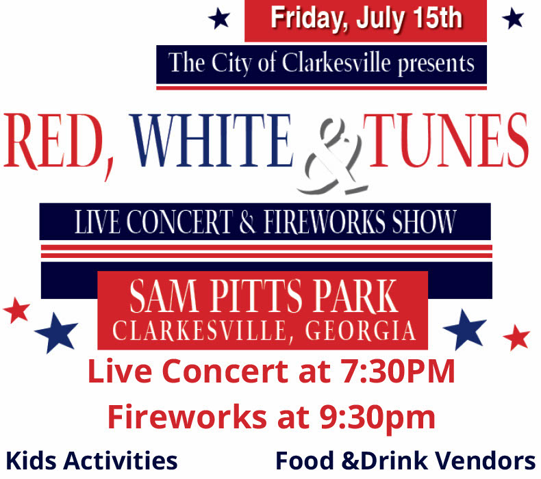 If you like concerts and fireworks, Clarkesville has punched your ticket for weekend fun. The city is hosting Red, White, and Tunes this Friday, July 15, at Pitts Park.