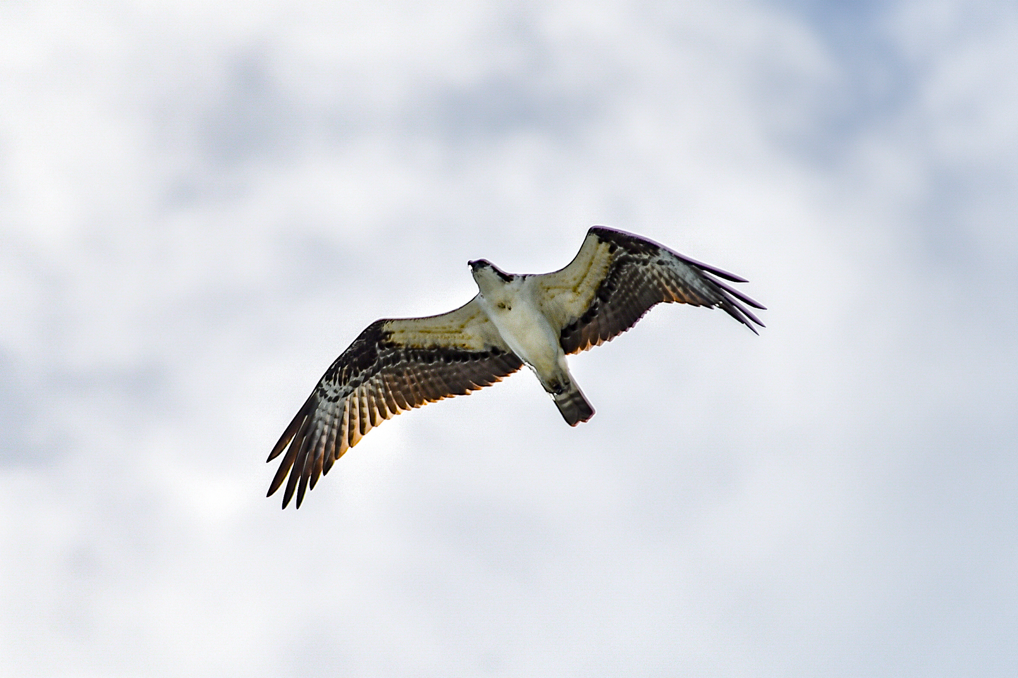 Watching the Ospreys soar above the water is fascinating. They circle, watching for fish below. Unbelievably, Ospreys can see small fish below the surface from well above them. They dive for the fish feet first, grasping the fish swimming in relatively shallow water with their talons. Size-wise, Ospreys are a little smaller that the Bald Eagle, with a wing span stretching longer than five feet in flight.