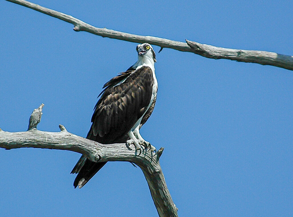 When they’re not fishing, Ospreys tend to sit high in trees where they can look over the land. And look they do. We watched one who continually turned his head side to side and almost all the way around for over an hour. While we weren’t sure what he was doing, he was definitely on-guard.