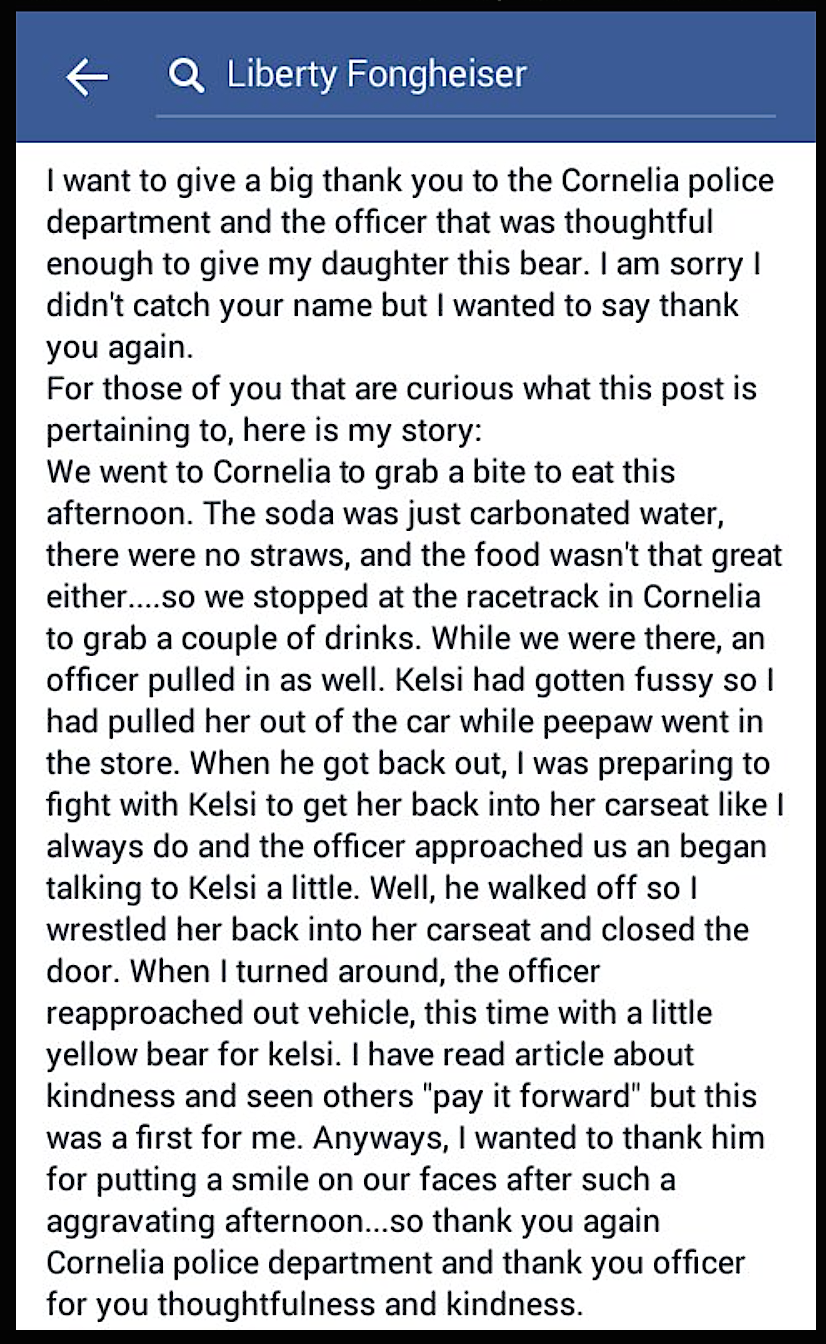 In a post to Now Habersham’s Facebook page, Liberty tells how she was struggling to get her fussy daughter Kelsi back into her carseat at the Race Trac in Cornelia when an officer approached and began talking with Kelsi. “Well, he walked off so I wrestled her back into her carseat and closed the door,” Fongheiser writes. “When I turned around, the officer reapproached our vehicle, this time with a little yellow bear for Kelsi.”