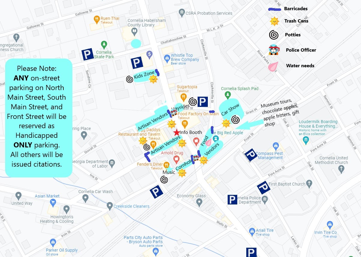 The blue boxes with the letter "P" on this map show where parking will be available for the Big Red Apple Festival. On-street parking is reserved for handicapped attendees. All others will be ticketed. (Source: City of Cornelia).
