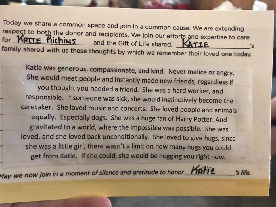 Transplant doctors were given a notecard presented to them by Katie’s family. It was barely bigger than an index card but the note spoke volumes about the enormity of Katie Richins’ spirit.