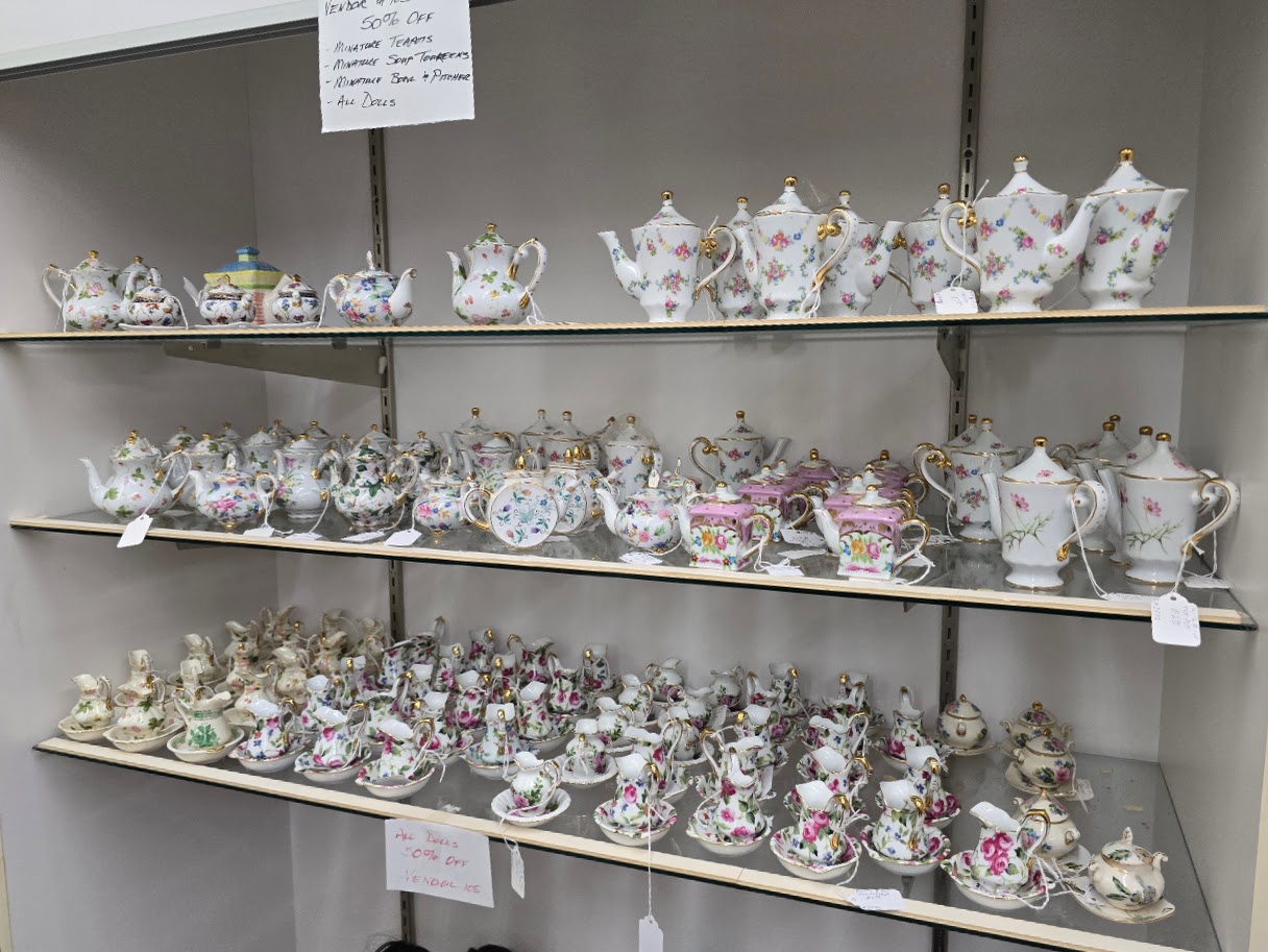 This mall allows vendors to bring their own style to their booths, so you might find things like quality reproduction metal signs alongside delicately printed miniature porcelain teapots. I was happy to stumble upon the latter while a 50% off sale was in progress, so I nabbed several of them at just $1.50 – $2.00 each.