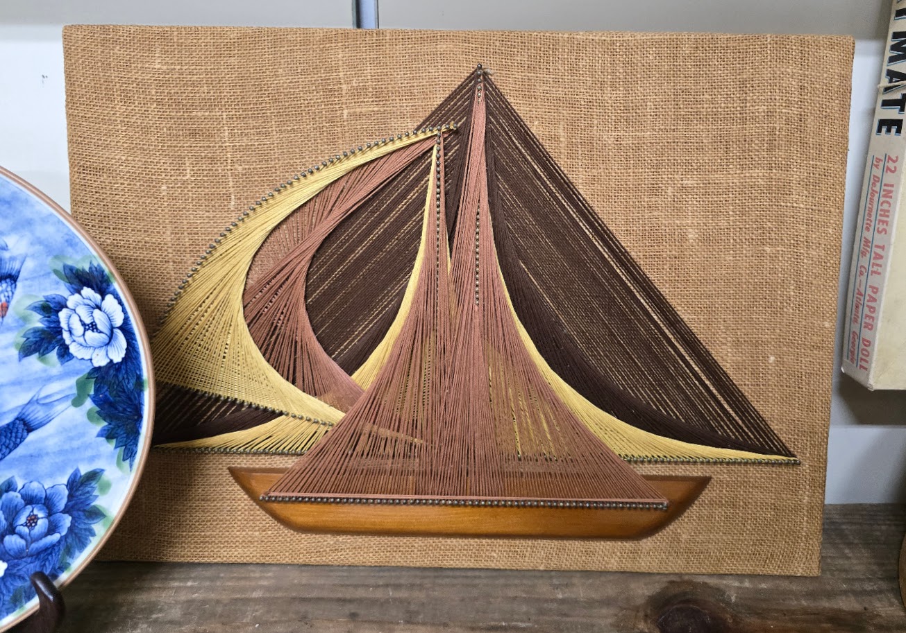 Luckily, I was able to do considerable back patting thanks to a couple of great scores I found in the upper level, including this retro string art sailboat in perfect condition. It didn’t have a price on it, so I took a photo of it along with another tag from the booth, which let the person at the register know who to call about a price. A price was negotiated, and it came home with me, lasting just a week or two in my space before it sold for several times the price I paid.