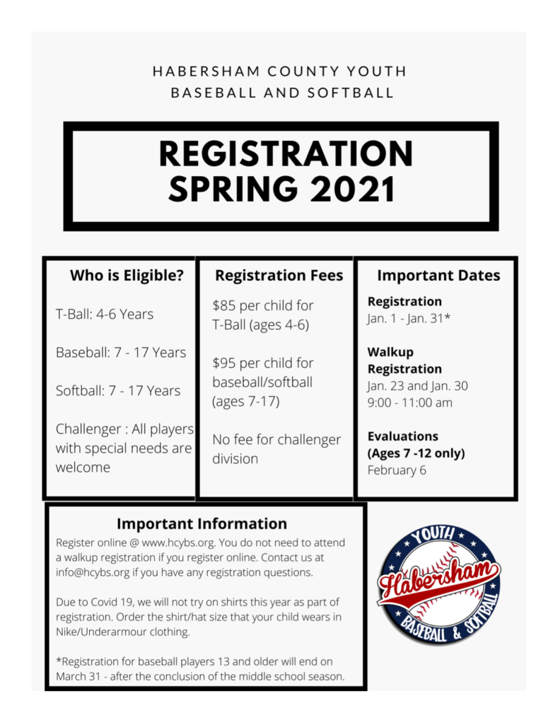 Girls and boys ages 4-17 may now sign up to play in the Habersham County Youth Baseball and Softball League. Information below. Register at www.hcybs.org.