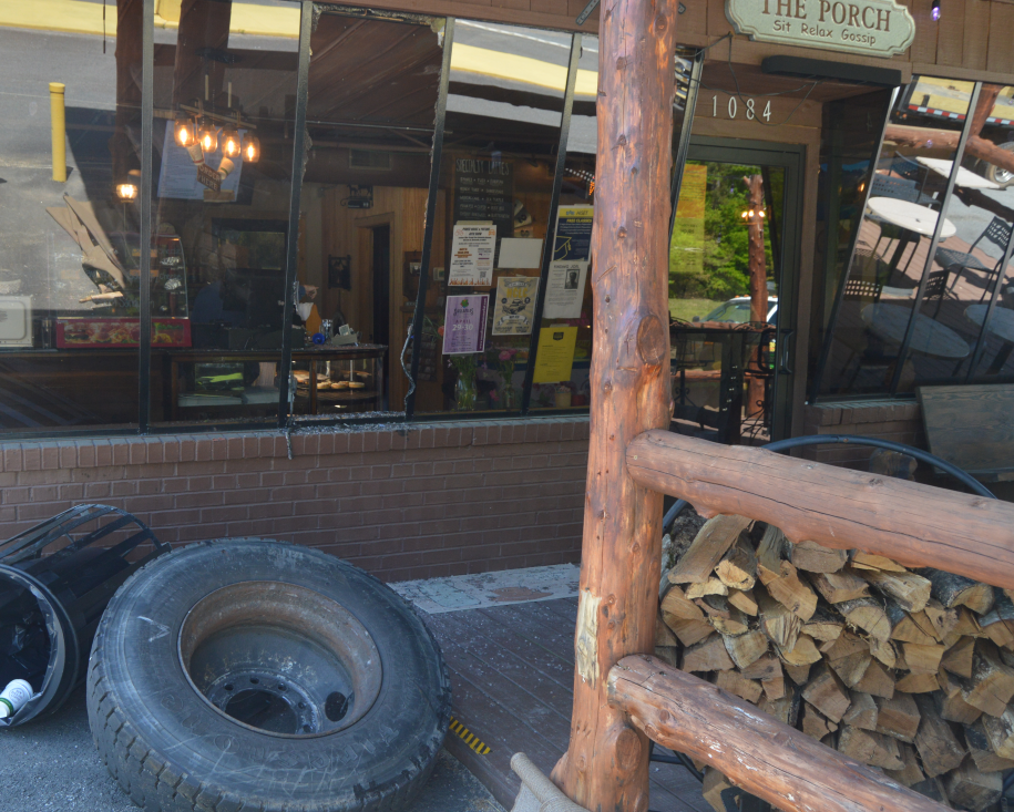 Late Monday morning, a runaway wheel struck the donut and coffee shop near Clarkesville, shattering a plate glass window.
