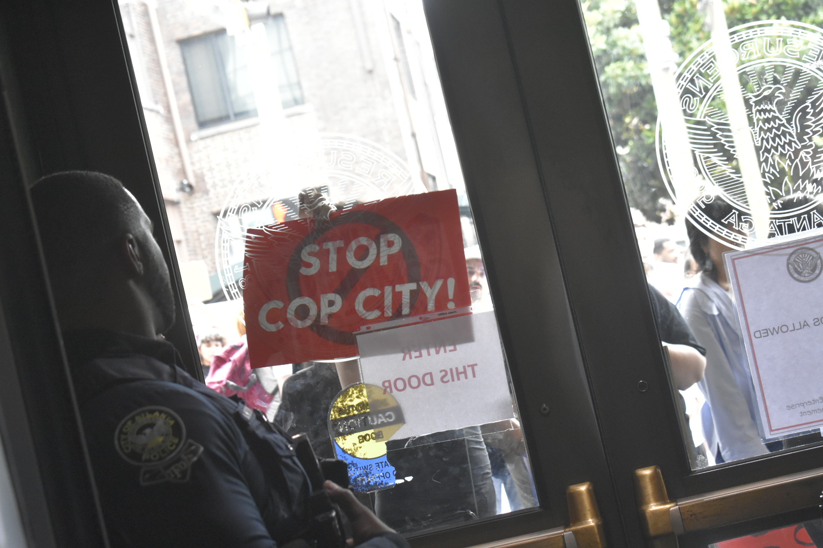 Community organizer Kamau Franklin estimated there were about 200 or 300 people on the outside, some of whom hoped to make public comments.