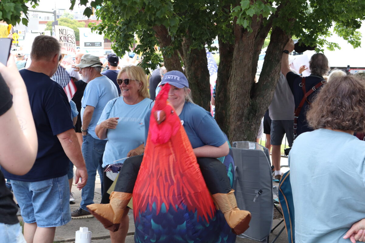 Event organizer Dallas Thompson, wearing an inflatable chicken costume, was delighted at the number of people who showed up for the protest. “I want to cry seeing so many people standing up for goodness and decency,” she said.