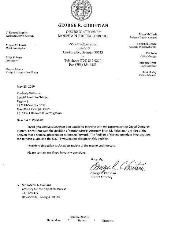 Habersham District Attorney, George Christian, has closed the case on the disappearance of more than a half million dollars in missing funds from the City of Demorest. In a letter to the Special Agent in charge of the investigation, Christian says, “In the findings of the independent investigation, the forensic audit, and the G.B.I. investigation…all support the decision.” District Attorney Christian also spoke with Now Habersham and added, “When large sums of cash are kept, for long periods of time, in an unlocked, unsecured cabinet, with multiple people having access, it is near impossible to bring charges.”