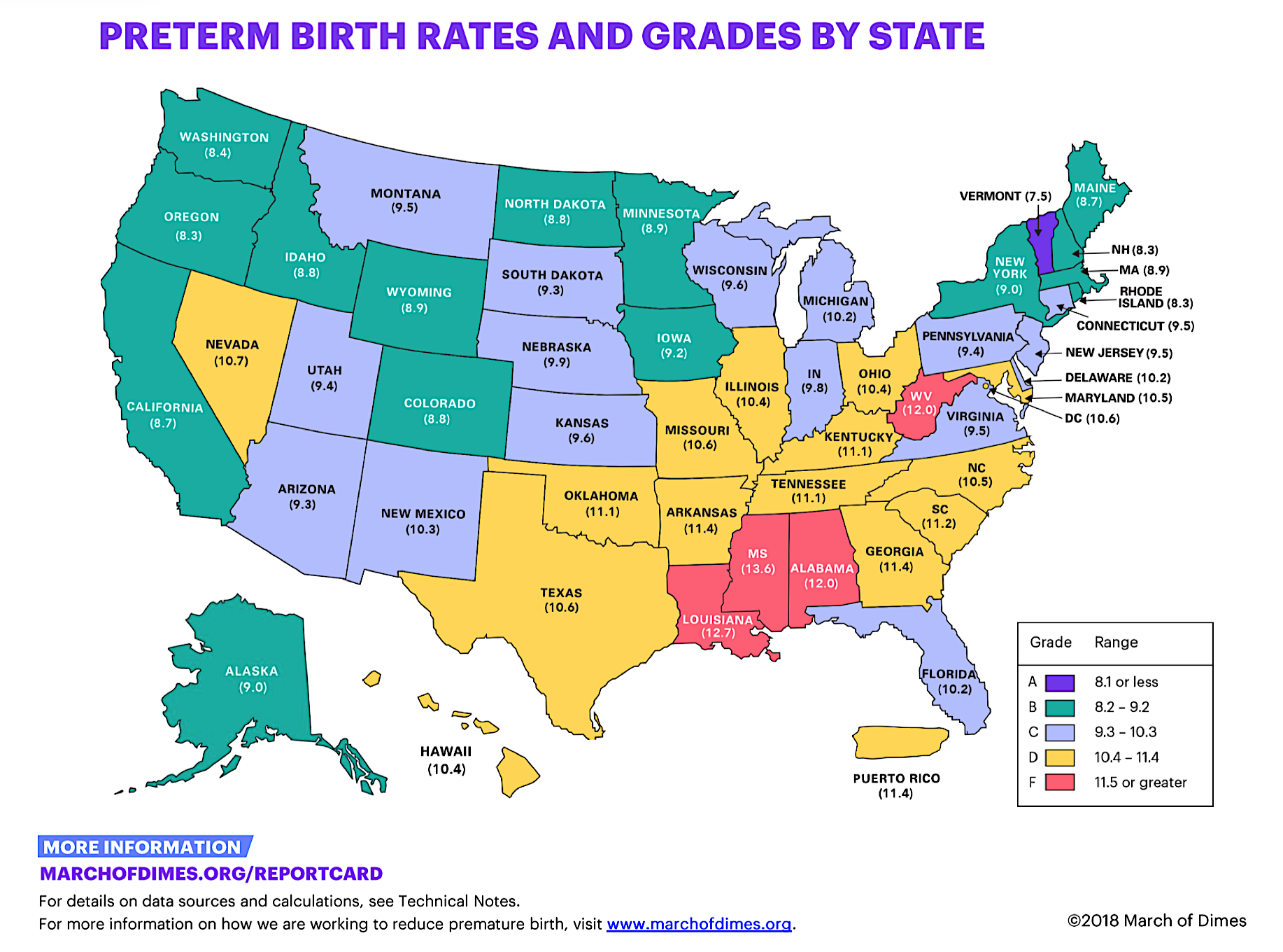 To earn an “A’’ grade, a state must have a preterm birth rate less than or equal to 8.1 percent. Only Vermont received the top grade in the 2018 report card.
