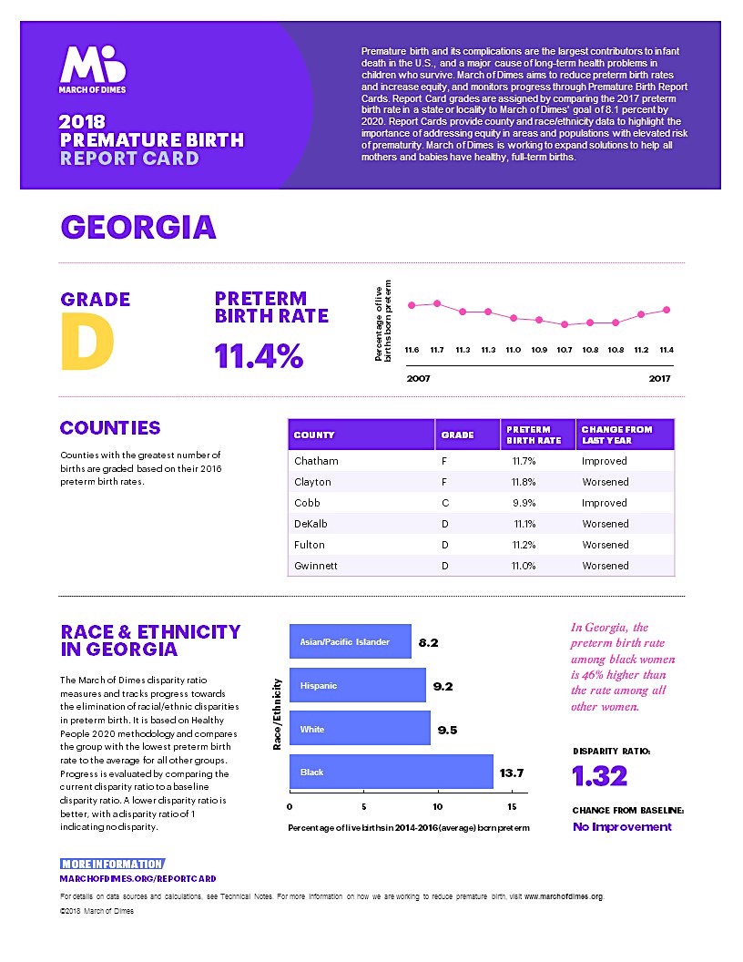 The March of Dimes report card also gave individual grades for the six Georgia counties with the most births in 2016. Chatham and Clayton received an “F,’’ though Chatham’s preterm rate improved; DeKalb, Fulton and Gwinnett each got a “D,’’ with a higher preterm rate in each; and Cobb earned a “C,’’ with an improved rate.