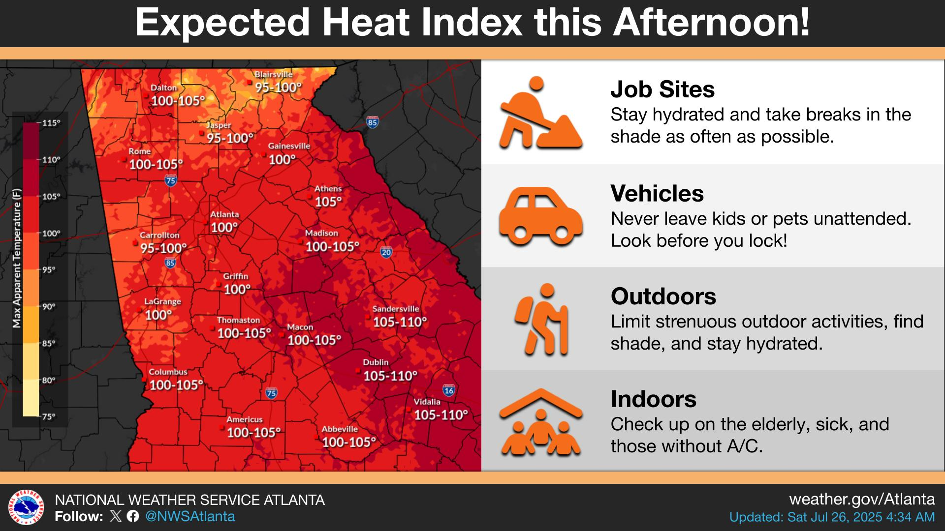 Cities including Atlanta, Athens, Columbus, Macon, and Rome could experience heat index values as high as 112 degrees Fahrenheit, according to NWS forecasts.