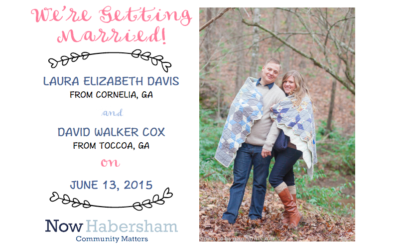 Laura Elizabeth Davis of Cornelia, Georgia is to marry David Walker Cox of Toccoa, Georgia on June 13, 2015.