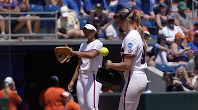 Lilli Backes on the mound for Georgia in Game 2 of the NCAA Super Regional against Florida on Saturday, May 24, 2025. The Bulldogs' 3-1 win forces GAme 3 in the series. (Georgia Softball/Facebook)