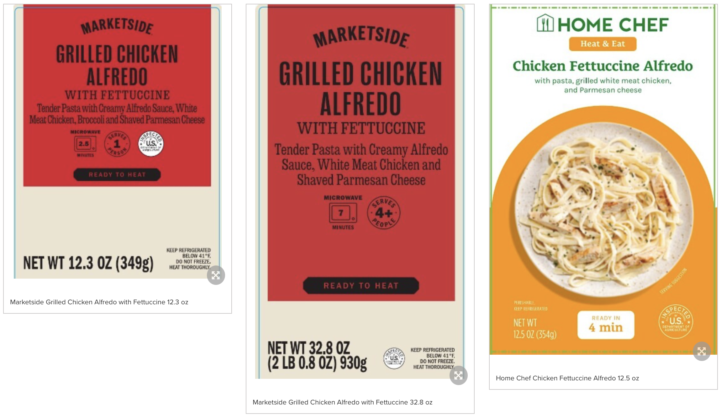 — 12.3-ounce trays of Marketside Grilled Chicken Alfredo with Fettuccine Tender Pasta with Creamy Alfredo Sauce, White Meat Chicken, Broccoli, and Shaved Parmesan Cheese with best-by dates of June 26 or earlier.