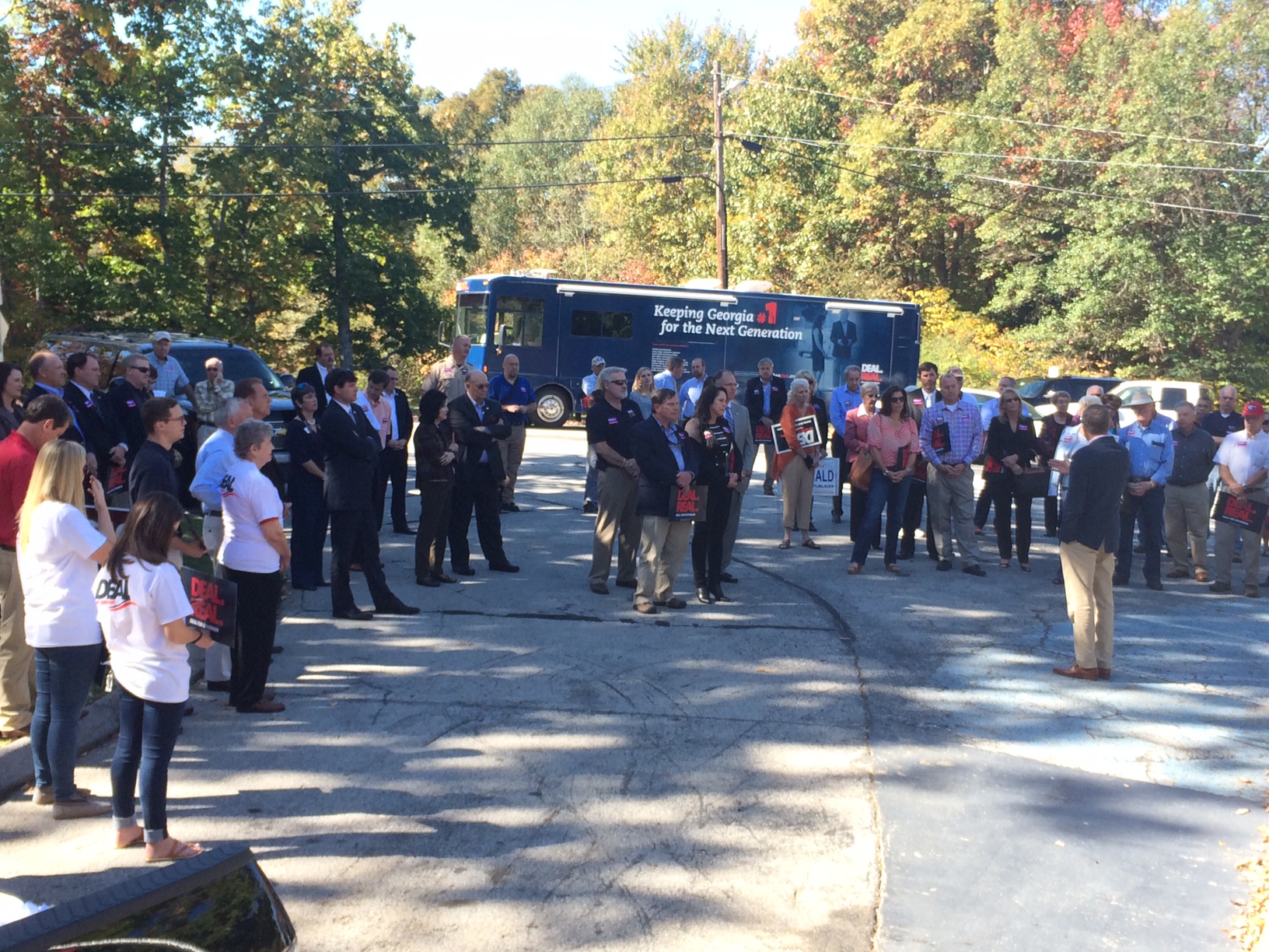 The Nov. 4 General Election is one week away and Republicans in Habersham are rallying behind their candidates. About fifty people turned out Monday to show their support for Georgia governor Nathan Deal and other state-wide elected officials. Deal, along with Lt. Gov. Casey Cagle, Secy. of State Brian Kemp, Public Service Commissioners Lauren “Bubba” McDonald and Doug Everett, and 9th District U.S. Rep. Doug Collins rolled into Habersham aboard Deal’s campaign bus. They stopped at the Community House in Cornelia which served as the backdrop for the event.