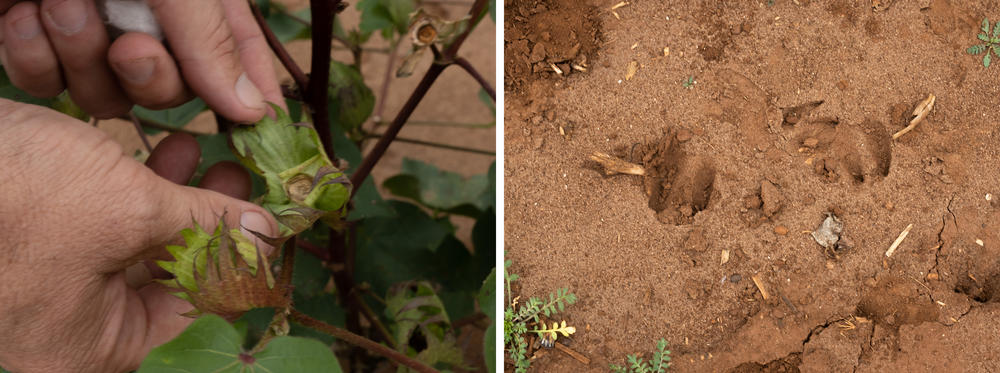 “See the tracks here?” Lee points to tracks surrounding all the cotton bushes. The tracks are big and small, for bucks and does. “And then if you look, I mean, just all this should be cotton.”