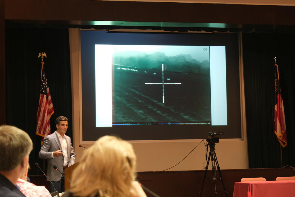 Adam Belflower shows members of Georgia’s Rural Development Council a video from a South Georgia farmer where deer can be seen eating cotton through a thermal scope. (Sofi Gratas / GPB News)