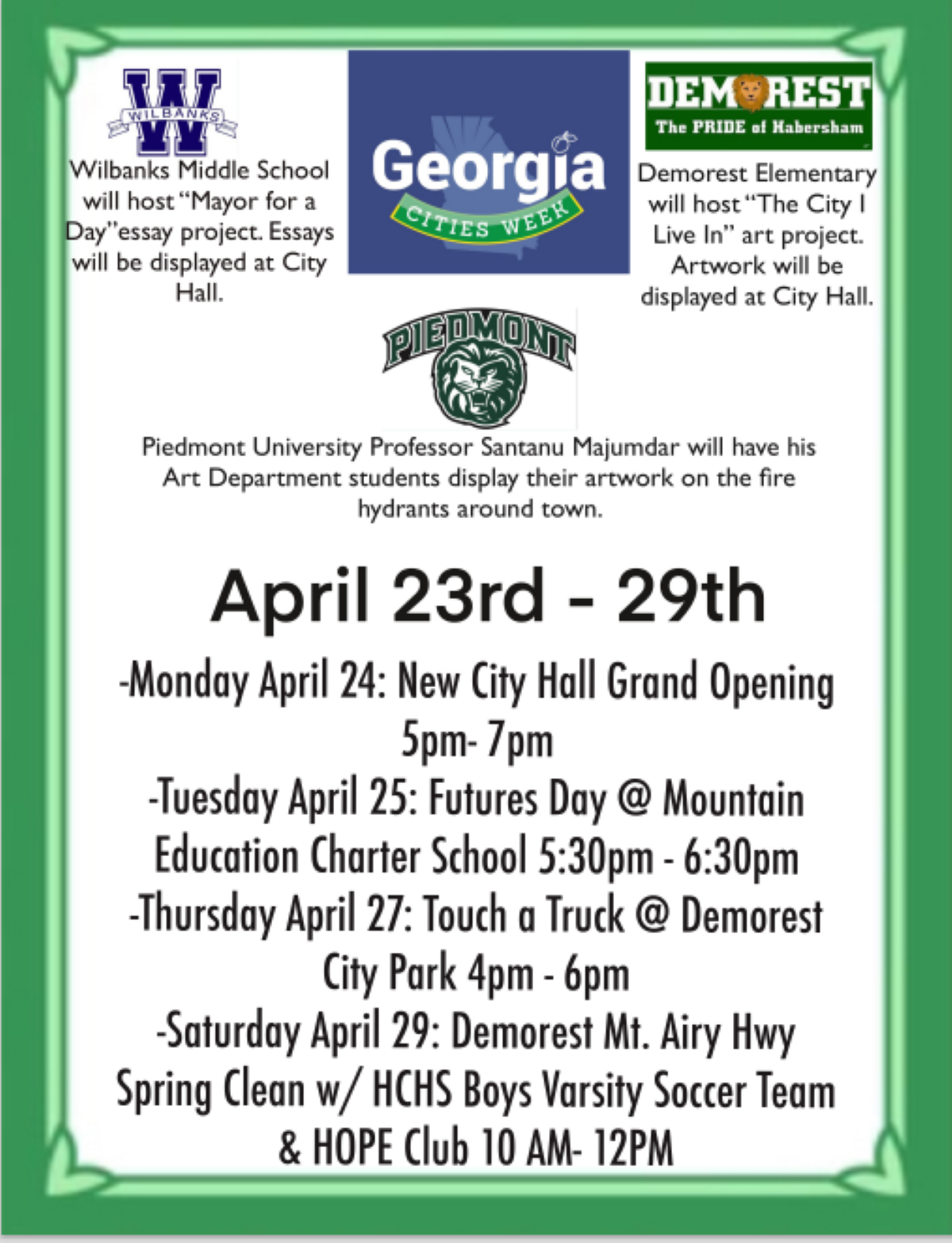 Monday’s celebration kicks off Demorest’s observance of Georgia Cities Week. Students at Wilbanks Middle and Demorest Elementary schools will participate with essay and art projects.