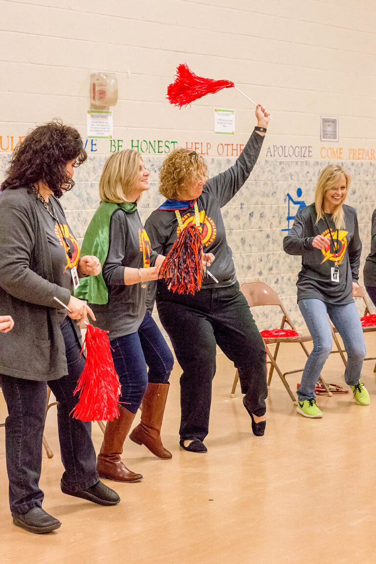 Demorest Elementary School faculty huddle with Leo the Lion during “Celebration Friday” on January 29th. (PHOTO/Jordan Thomas)