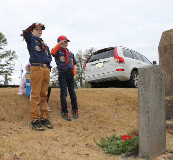 Scout Troops with Pack 5 (Clarkesville) and Pack 24 (Cornelia), who came together for the ceremony, then laid wreaths in single file before they saluted each one in honor of fallen service members.
