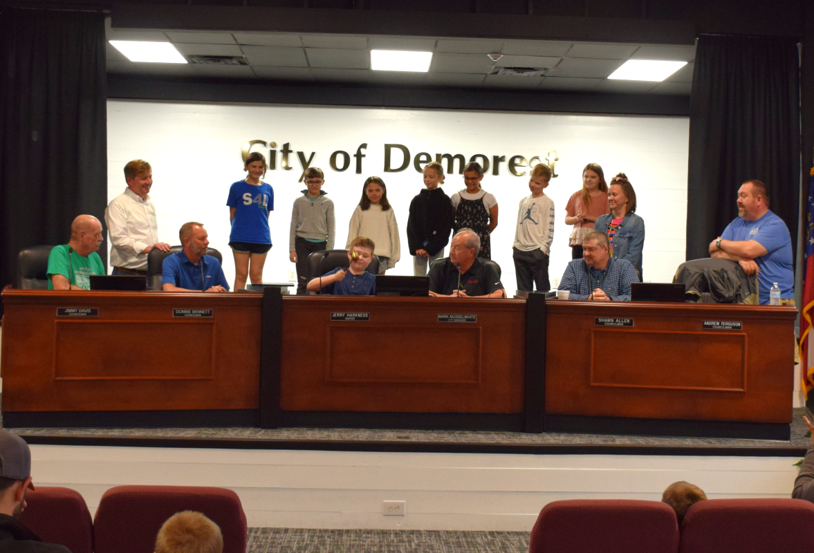 Just prior to the beginning of the work session, Demorest Mayor Jerry Harkness invited the students and their fourth-grade teacher, April LaHayne, to join the City Council on stage. Once on stage, Harkness selected fourth-grade student Rhett Parham to sit in the Mayor’s seat to “drop the gavel” to call the work session to order.