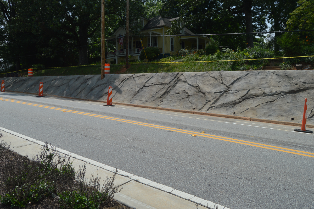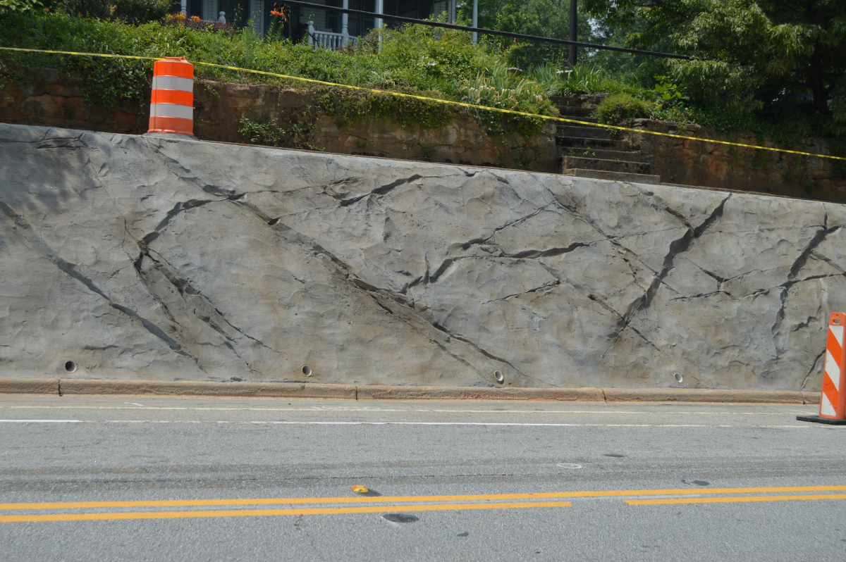 “I think the wall looks great. It gives it a different texture rather than just sprayed on concrete. It’s to look like an aged granite rock with different weather-worn areas.” He adds that it is reminiscent of rock formations that a person would see going through the North Georgia mountains. “I think it’s got a very unique style to it.”