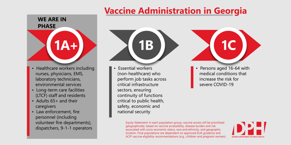 Effective Jan. 11, Georgia will be in phase 1A+ of its vaccine administration plan. That phase includes healthcare workers (physicians, nurses, EMS personnel, laboratory technicians, environmental services, etc.); residents and staff of long-term care facilities; adults aged 65+ and their caregivers, as applicable; and law enforcement, firefighters, 9-1-1 dispatchers, and first responders.