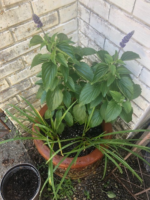 Last year this huge urn was home to a beautiful red Mandevilla. This year, I’m giving it a fresh look with salvia, daylilies, and Purple Heart. The Stella d’Oro daylilies, my filler, were transplants from one of my flower beds that were in need of dividing. The Purple Heart was also divided from another container as my spiller. The salvia is a new addition and serves as my thriller.