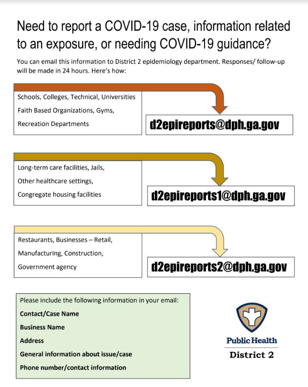 (Gainesville) – The District 2 Public Health Epidemiology Section has a new method that Covid-19 cases can be reported, get information, or verify guidance. The department has set up three separate email accounts to handle each activity.